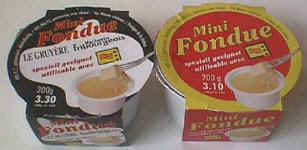 と Freiburger Vacherin を使った正統派(?)ですね。右のは、いろんなチーズが混じっているようです。これはカップヌードル・ミニぐらいの大きさの容器に入っていて、電子レンジで暖めてからパンを突っ込んで食べられるようになっていますから、ちょっと食べたい時(もしくは一人で食べる場合)には、お手軽で便利かもしれません。Fondue鍋も必要ないし後片付けも簡単ですね。インスタント物が好きでない人には見せられませんが、まあこんなものもあるよ(^o^)丿というお話です。Migrosで発売されています。 |