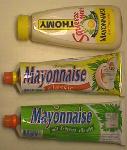 一番上の黄色い蓋の容器の物がTOMY製で、その下2つのチューブがMIGROS製です。TOMY発売のマスタードもまったく同じで、マスタードの新容器はマヨネーズと同じくプラスチック製になってます。何でこんな事でって思わないでね。日本では全然気にした事も無いマヨネーズの容器とかってヨーロッパ産の物は随分遅れているんですもん。但しゴミ問題を考えると、アルミ製の物だろうがプラスチック製の物だろうが殆ど変わりなく、使い終わったらゴミ箱行きなのでビンに入って売っている物のほうがリサイクル出来て良いかも。人によってはプラスチックや金属の味がするのでビンの方が好きと言う声も時々聞きます。